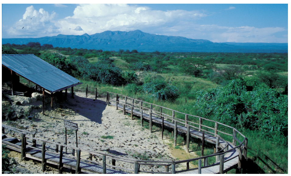 图1 Olorgesailie盆地地貌景观 近处人行通道旁展示暴露于地表的、密集分布的手斧和其他石制品。照片由Ignacio de la Torre授权发表