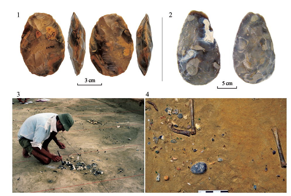 图2 Boxgrove遗址 1、2.遗址出土的手斧Handaxes excavated from the site;3.GTP17地点石制品成组分布场景The groupings of scatters of artifacts at the locality of GTP17;4.Q1/B地点石制品和化石出土场景Artifacts and fossils excavated at the locality of Q1/B.Copyright of the Boxgrove Project