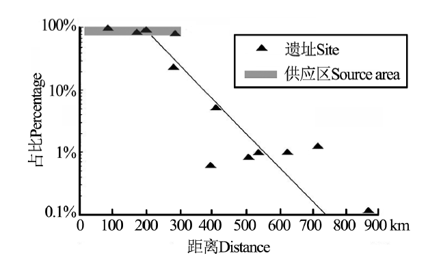 Fig.1 Percentage of obsidian in the total chipped stone industry plotted against obsidian source distance for Near Eastern Early Neolithic sites[41]