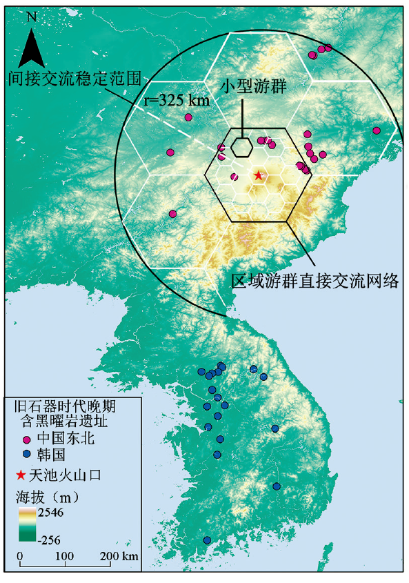 本文以原料产地距离衰减效应为视角,根据目前中国东北地区和韩国旧石器时代晚期黑曜岩石制品的发现情况以及黑曜岩产源地研究成果,结合狩猎采集人群社交网络模型、民族学、考古学资料,对以长白山为核心的黑曜岩源产地对中韩两地的辐射影响作出了直接供应区(天池火山口为圆心辐射半径150~200 km)和接触区(距离天池火山口200 km以上)的划分。在此基础上对比研究两地的黑曜岩石制品,发现由于距离源头产地较远,韩国黑曜岩石制品的数量以及类型丰度均低于中国东北地区。而又由于原料的长距离损耗以及对于原料更加经济的开发利用,导致韩国典型遗址中黑曜岩细石核与完整石片的体积更小,原料缩减更甚。