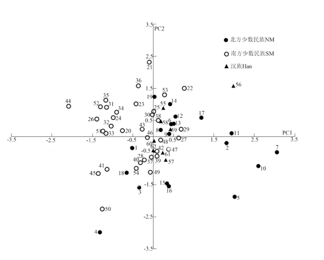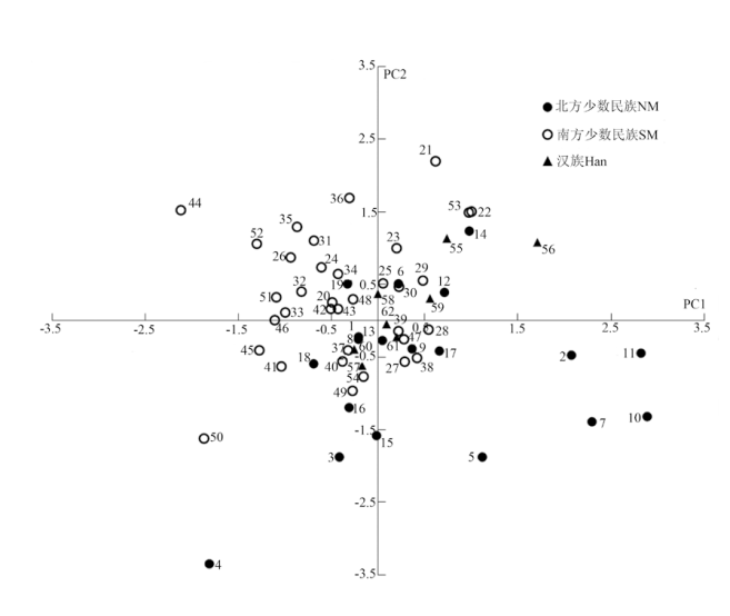 头面部的测量指标是生物人类学研究的重要内容,目前缺少中国人群齐全的头面部测量指标大数据的比较研究。本文根据近年来采集到的中国62个人群(53个民族)及外国人群的头面部指标数据,进行主成分分析,探讨中国人群之间头面部特征的差异与共性,分析中国人与外国人群头面部特征的不同之处。研究发现,中国人群头面部特征分为北方类型和南方类型,北方少数民族人面较高、耳较长、鼻较高、上唇皮肤部较高,南方少数民族面较低、耳较短、鼻较低、上唇皮肤部较低,汉族介于二者之间。与外国人群相比,中国人耳较长,鼻较狭,面较宽。中国人的头面部形态与尼格罗人种差距较大,相对接近于高加索人种。