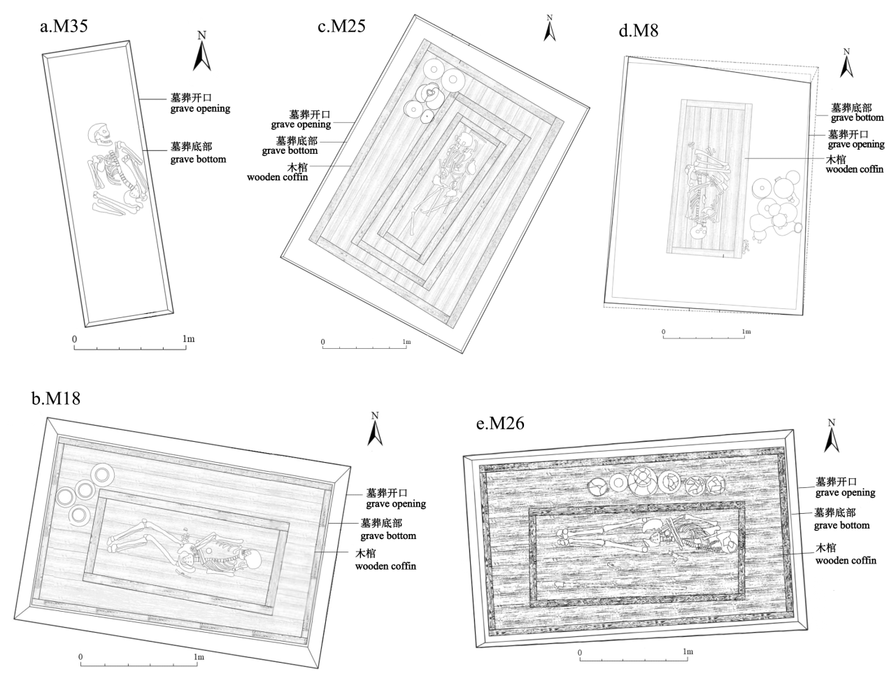 图2 后石墓地墓葬平面图 a. M35,屈肢葬flexed position;b. M18,侧身屈肢flexed on the side,改绘自文献[26] / Modified form [26];c. M25,侧身屈肢flexed on the side;d. M8,仰身屈肢flexed supine position;e. M26,侧身直肢extended on the side