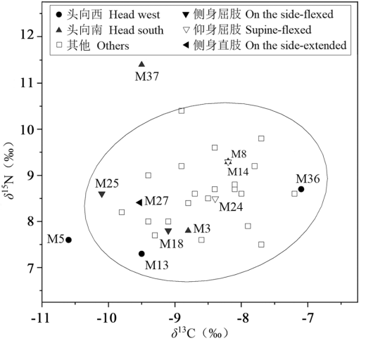 Tab.1 Comparison of carbon and nitrogen isotope values of different groups at Houshi cemetery