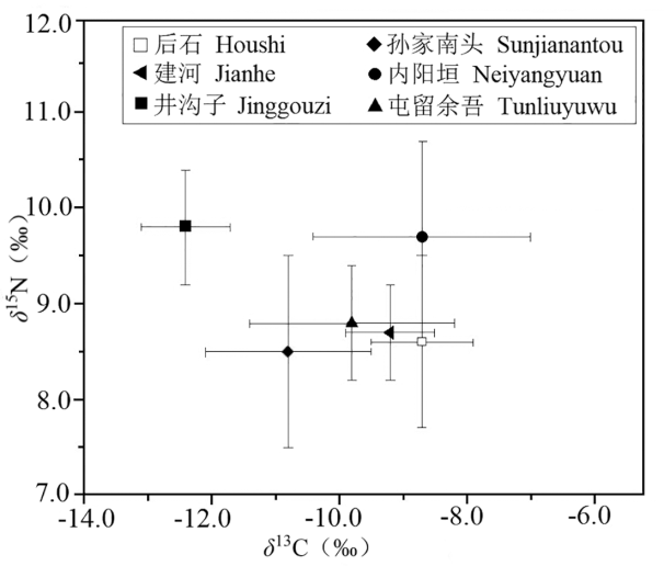 Fig.5 Error bar plot of carbon and nitrogen isotope values of Houshi population and other contemporary populations in nearby regions