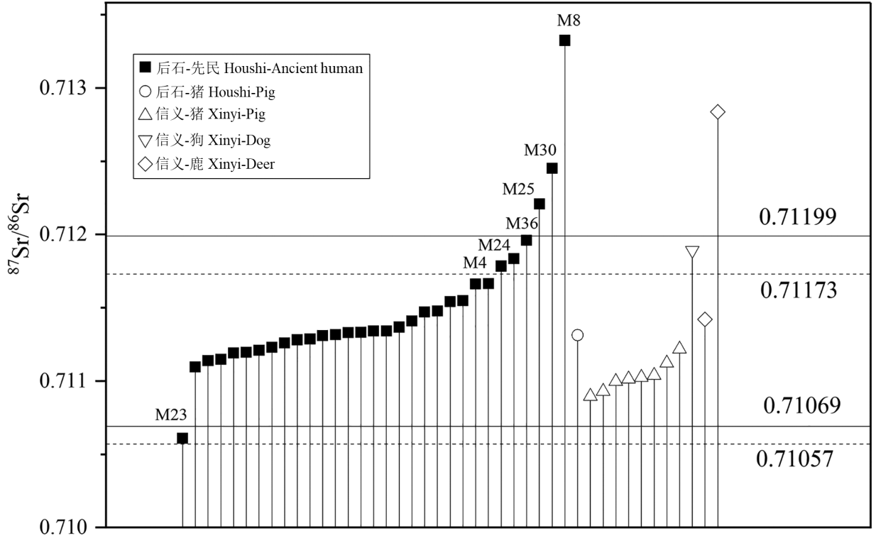 图6 后石墓地先民与动物牙釉质锶同位素比值垂线图 注:虚线Dashed line—根据猪狗牙釉质锶同位素值确定的本地范围local range, defined by strontium isotope values of pigs and dogs;实线Solid line—根据人牙釉质锶同位素值确定的本地范围 local range, defined by strontium isotope values of humans