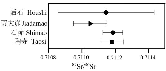 图7 后石墓地与周边遗址锶同位素比值本地范围的误差棒图 基于家养动物牙釉质锶同位素值