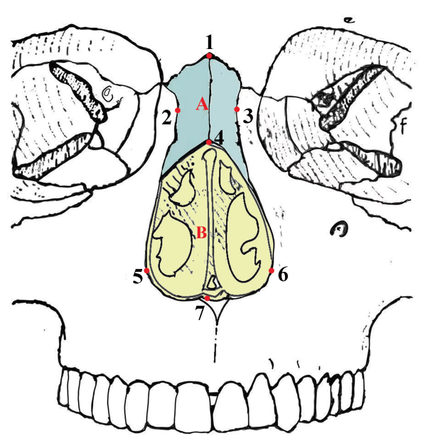 图2 鼻部解剖区域及测量特征 A.鼻骨区域nasal bone region;B.梨状孔区域piriform foramen area;A+B.鼻部区域nasal region。连接1-4点:鼻骨高height of nasal bone;连接4-7点:梨状孔高height of nose hole;连接1-7点鼻高nasal height;连接2-3点:最小鼻宽simoticchord;连接5-6点:鼻宽nose width