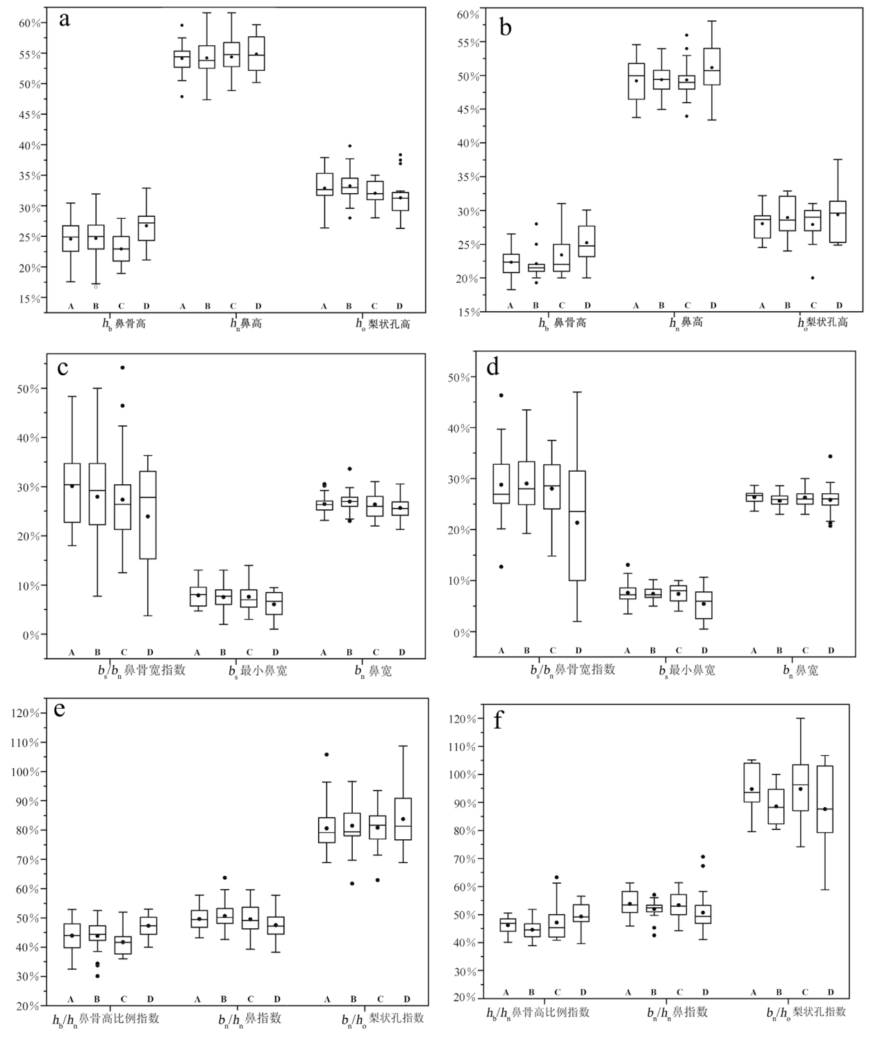 图3 不同时期的鼻部线性数值、指数分布图 A.仰韶Yangshao;B.东周Eastern Zhou;C.西汉Western Han;D.明清Ming and Qing; a.男性鼻骨高、鼻高和梨状孔高的分布Distribution of nasal bone height, nasal height and piriform foramen height in males;b.女性鼻骨高、鼻高和梨状孔高的分布Distribution of nasal bone height, nasal height and piriform foramen height in females;c.男性鼻骨宽指数、最小鼻宽和鼻宽的分布Distribution of nasal bone width index, minimum nasal width and nasal width in males;d.女性鼻骨宽指数、最小鼻宽和鼻宽的分布Distribution of nasal bone width index, minimum nasal width and nasal width in females;e.男性鼻骨高比例指数、鼻指数和梨状孔指数的分布Distribution of nasal bone high proportion index, nasal index, and piriform foramen index in males;f.女性鼻骨高比例指数、鼻指数和梨状孔指数的分布Distribution of nasal bone high proportion index, nasal index, and piriform foramen index in females.
