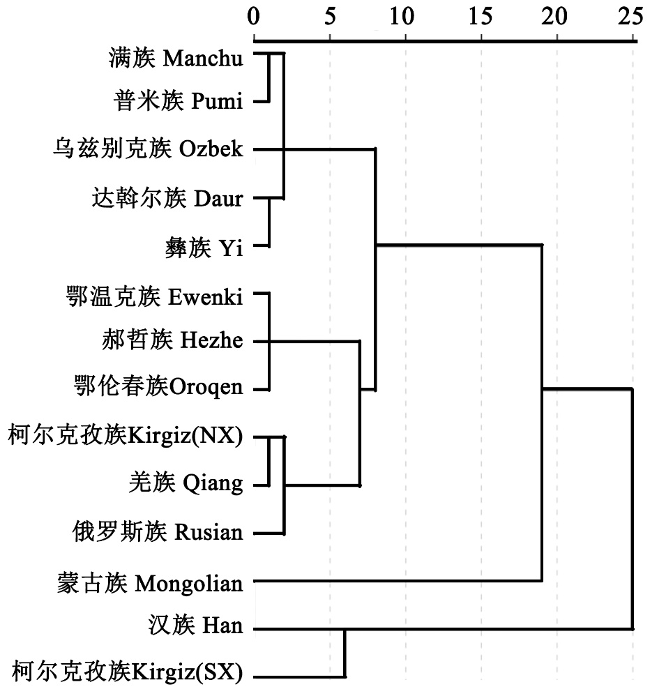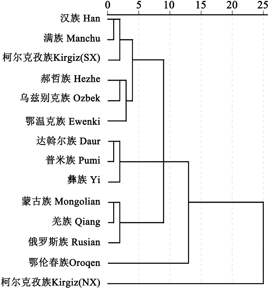 | 乌孜别克族Uzbek[ | 110 | 3.7-5.1-2 | 1.84 | 0.82 | 91 | 5.9-4.9-1.4 | 1.53 | 2.39 |