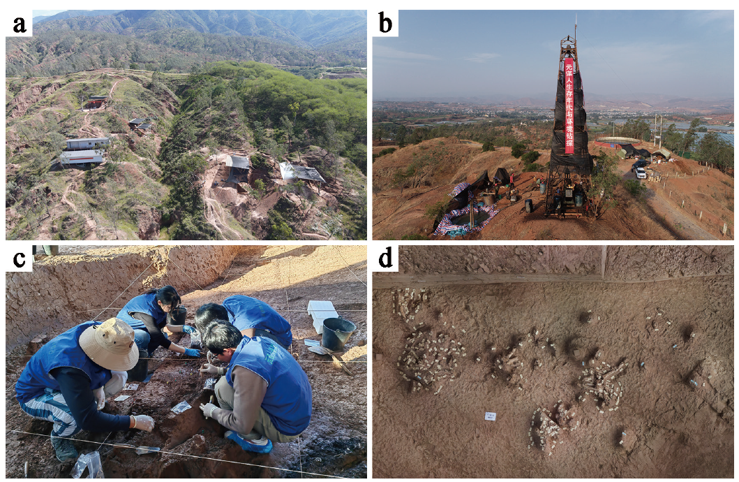 Fig.1 a.郭家包梁子2023年度考古发掘区域航拍照;b.牛肩包科学钻探;c.考古发掘场景;d. 2023-B发掘区揭露的大量动物化石 New round excavation at the Yuanmou hominin site a. Aerial photograph of the 2023 excavation area at Guojiabaoliangzi; b. Scientific drilling at Niujianbao; c. The scene of archaeological excavation; d. A large number of animal fossils uncovered in excavation area 2023-B.