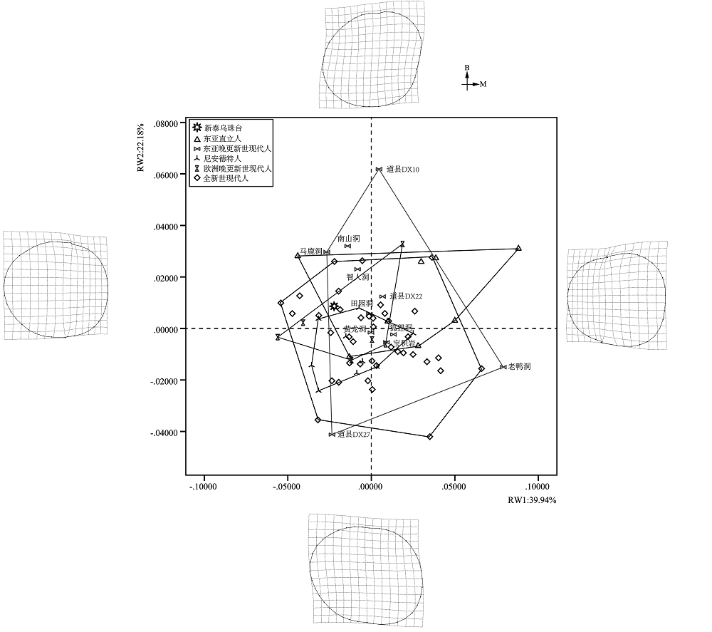 Fig.3 Geometric morphometric analyses of the crown outline shape of Wuzhutai M3 and other comparative specimens (TPS-grids correspond to the positive-value or negative-value extremes of RW axis). RW:relative warp; B: buccal, M: mesial