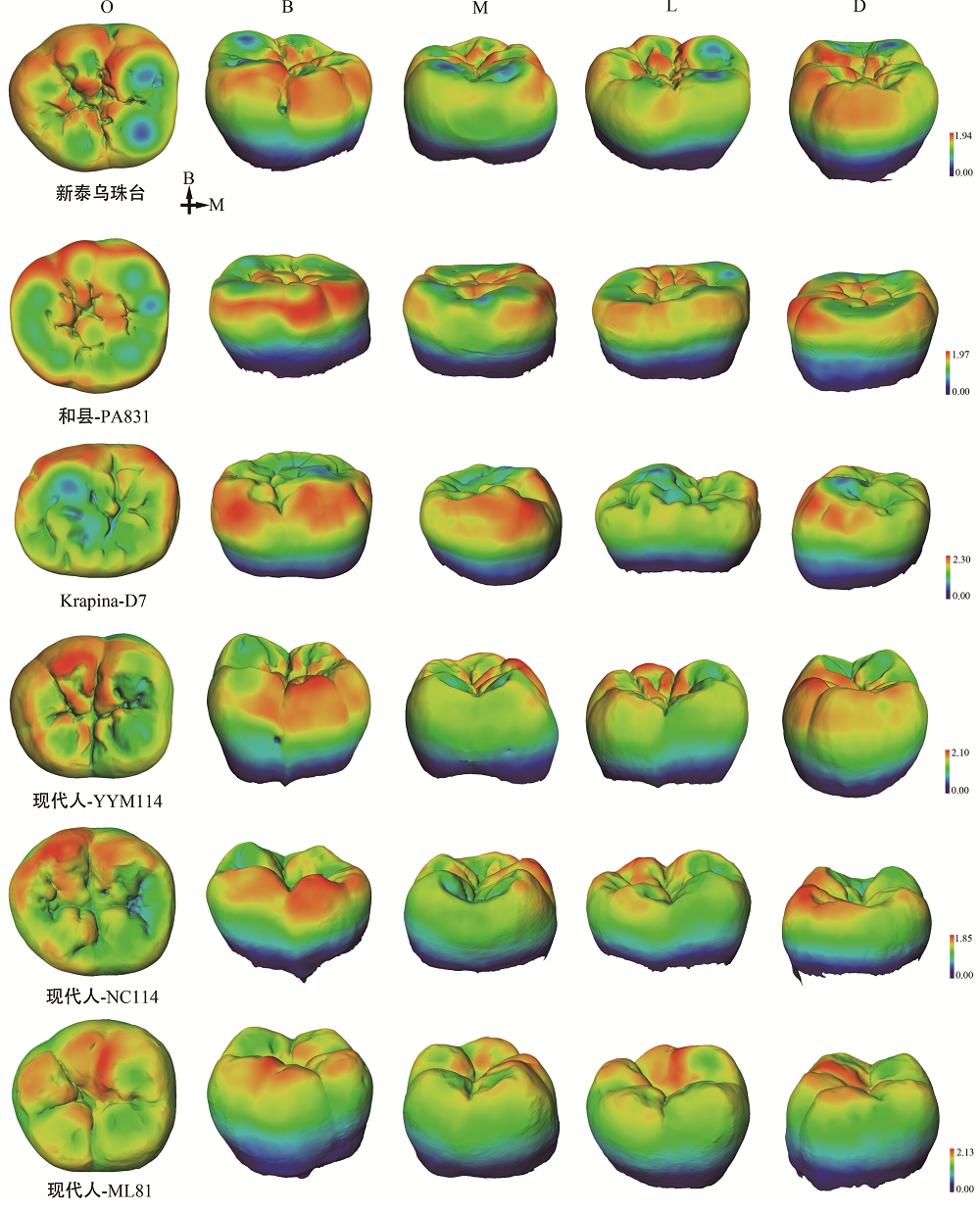 Fig.4 The distribution patterns of 3D enamel thickness in Wuzhutai M3 and other five specimens The comparative specimens include H. erectus (PA831), Neanderthal (Krapina D7,downloaded from NESPOS), and recent modern humans (YYM114, NC114, ML81). The photos were mirror-imaged to facilitate the visual comparisons if they are right M3. The images were not scaled;O: occlusal; B: buccal; M: mesial; L: lingual; D: dista