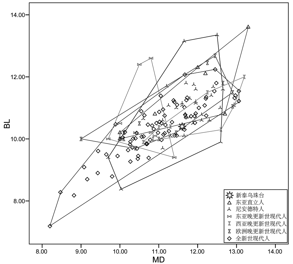 Fig.5 Bi-variable plots of the crown sizes of Wuzhutai M3 and the comparative specimens (MD: mesiodistal dimension; BL: buccolingual dimension)