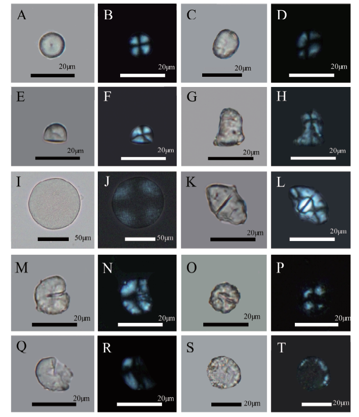 Fig.4 Unidentified starch grains extracted from grooved basins IXa类:A和B;IXb类:C和D;IXc类:E~H;IXd类:I~N;IXe类:O~T(scale bar: I and J=50 μm; others=20μm)