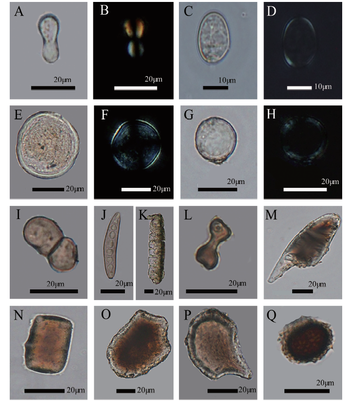 Fig.5 Phytoliths, pollens and mineral particles extracted from grooved basins (scale bar: C and D=10μm, others=20μm) A~H:矿物;I:未知颗粒;J:蕨类植物;K:棒型植硅体;L:哑铃型植硅体;M:尖型植硅体;N:方型植硅体;O:芦苇扇型植硅体;P:水稻扇型植硅体;Q:植物孢子