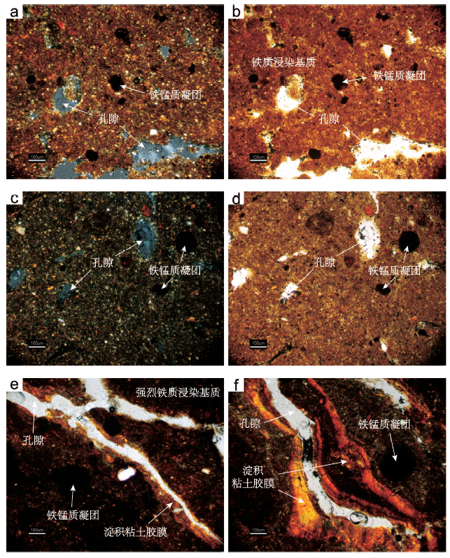 图3 伞顶盖遗址不同地层单元的沉积物微形态照片 注:a(正交偏光)和b(同一区域单偏光)指示第2层黄红色土层,采样深度47-52 cm;c(正交偏光)和d(同一区域单偏光)指示第3层均质红土层,采样深度87-92 cm;e(单偏光)和f(单偏光)指示第4层网纹红土层,采样深度110-115 cm。a (cross-polarized light, XPL) and b (plane-polarized light, PPL) indicate the yellow-red clay of Layer two, sampling depth 47-52 cm; c (XPL) and d (PPL) indicate the homogeneous red soil of Layer three, sampling depth 87-92 cm; while e (XPL) and f (PPL) indicate the vermiculated red soil of Layer four, sampling depth 110-115 cm