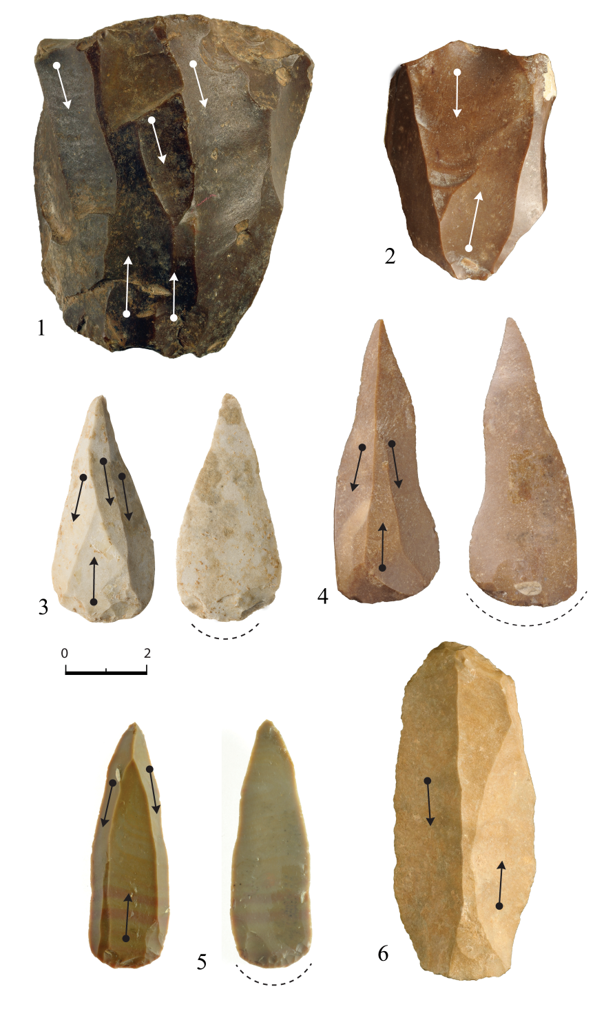 Fig.2 Diagnostic Emiran artifacts (note the bidirectional scar pattern) Bidirectional blade cores: 1 Emireh Cave; 2 Boker Tachtit. Emireh points: 3 Emireh Cave; 4-5 Boker Tachtit. Endscraper: 6 Emireh Cave