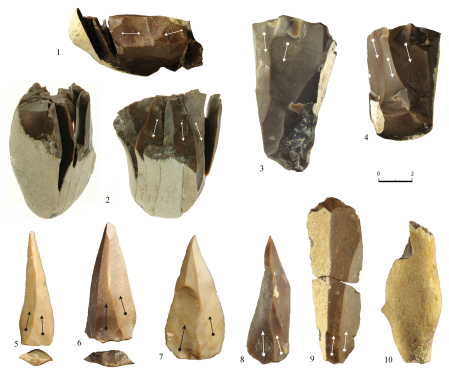 Fig.3 Refitted cores(1, 2) and diagnostic artifacts(4-10) from the Boker Tachtit 1. Bidirectional core from Level 2(the Emiran phase); 2. Unidirectional core from Level 4; 3-4. Unidirectional blade cores from Level 4; 5-8. points from Level 4; 9. Endscrape from Level 4; 10. burin from Level 4; Note the unidirectional scar pattern