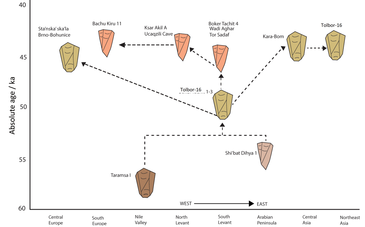 旧石器时代晚期初段,系统剥取石叶尖状器技术开始出现并见于欧亚大陆不同地区,这一现象被认为与MIS 3阶段现代人的扩张密切相关。黎凡特旧石器时代晚期初段的界定标准源自以色列内盖夫沙漠Boker Tachtit(波克·塔吉特)遗址两组连续叠压的石器工业,遗址下部的Emiran(埃米尔)石器工业以双向剥片石叶技术为特征,上部石器工业则以单向剥片石叶技术为标志。Boker Tachtit遗址一直缺乏较可靠的年代学基础,但新近放射性测年数据表明Emiran工业并存于黎凡特本土的莫斯特晚期石器工业,Emiran工业为外来的推测也由此得到了支持。由于Boker Tachtit与尼罗河谷地及南阿拉伯地区年代接近的石器工业技术特点相似,早期的Boker Tachtit人群很可能来自上述区域。Emiran工业在Boker Tachtit演变为单向剥片石叶工业的同时一直向欧洲中部及亚洲中北部地区扩张。与之类似,单向剥片石叶工业一面向黎凡特北部及巴尔干地区传播,一面在本地发展成为早期Ahamarian(艾玛尔)工业技术体系。因此旧石器时代晚期初段至少发生过两次人群扩散事件,第一次为来自尼罗河流域及阿拉伯半岛人群在迁徙至黎凡特后向欧洲中部与亚洲中北部地区的迅速扩张;第二次事件的发生年代略晚,表现为黎凡特南部人群向黎凡特北部及巴尔干地区的逐步扩散。