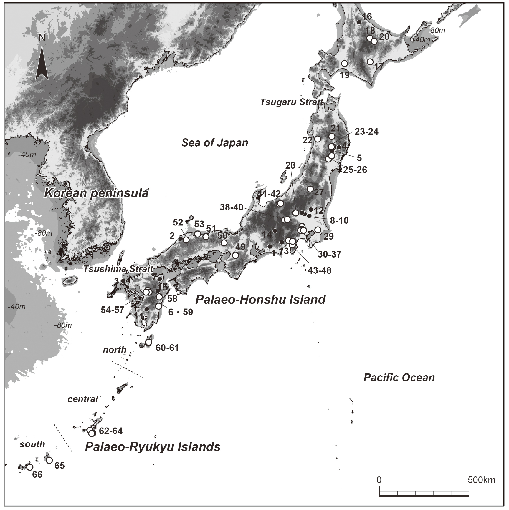 Fig.1 Palaeo-geography of the Pleistocene Japanese Archipelago with the location of possible LP and MP, and representative EUP sites in the Japanese Archipelago. The base map is ETOPO_1 modified by QGIS_3.16.5_Hannover. The lowest sea-level was 80m below present as realized between 37 kaBP and 30 kaBP [15]. EUP sites dotted here are those with reliable AMS dates compiled in ref.[7]. LP: 1. Kaseizawa; MP: 2. Sunabara, 3. Iriguchi, 4. Kanedori, 5. Kashiyamatate, 6. Ushiromuta, 7. Sozudai, 8. Fujiyama, 9. Kiribara, 10. Gongenyama 1, 11. Ono, 12. Hoshino-tankenkan, 13. Nutabura, 14. Takesa-Nakahara, 15. Kamishitada, 16. Rubenosawa; EUP: 17. Wakabano-mori, 18. Kyu-shirataki 3, 19. Syukubai-kaso, 20. Akita 10, 21. Itabashi III, 22. Jizoden, 23. Gando-zutsumi, 24. Kamihagimori, 25. Okubo, 26. Yakuraihara 15, 27. Sasayamahara 16, 28. Tomita-miyashita, 29. Sumifurusawa, 30. Fujikubo-higashi, 31. Nakahigasi 2/3, 32. Musashikokubunji-ato, 33. Musashidai-nishi, 34-35. Musashidai, 36. Kamadera-higashi, 37. Donoshita, 38. Happuzan II, 39. Kosakayama, 40. Oiwake I, 41. Hinatabayashi, 42. Kannoki, 43. Idemaruyama, 44. Mukaida A, 45. Nishibora, 46. Umenokizawa, 47. Nodai-minami, 48. Fujiishi, 49. Minenosaka, 50. Itaiteragatani, 51. Onbara I, 52. Harada, 53. Shimogitaigyuhara, 54. Setaikenohara, 55. Kawahara 14, 56. Ishinomoto 8, 57. Ishinomoto 54, 58. Yamada, 59.Ushiromuta, 60. Yokomine C, 61. Tachikiri, 62. Minatogawa, 63. Yamashitacho, 64. Sakitari, 65. Pinza-abu, 66. Shirahosaonetabaru
