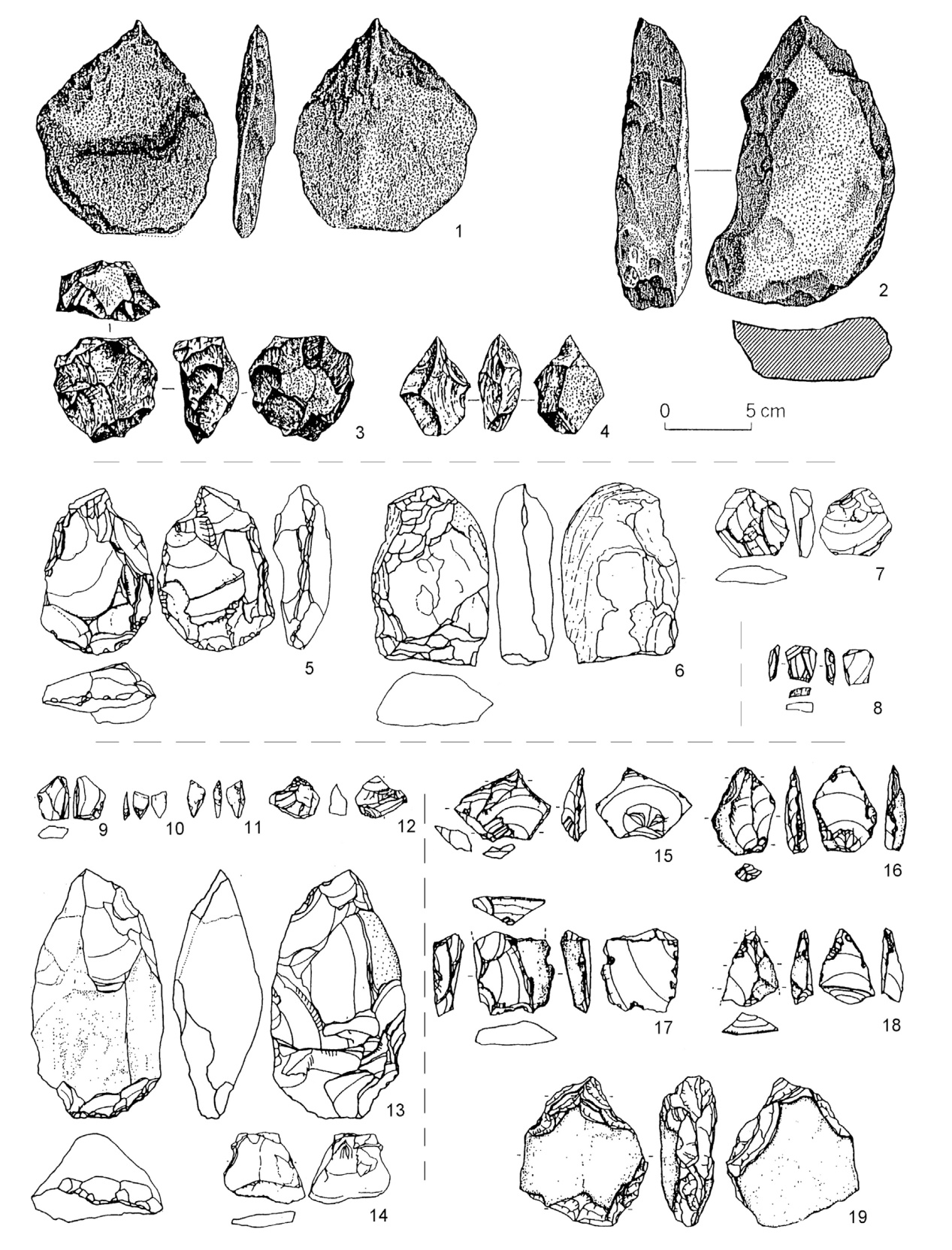 Fig.2 Illustrations of possible LP and MP lithic tools[30] 1-4: Kaseizawa, 5-7: Kanedori cl.4, 8: Kashiyamatate cl.4a, 9-14: Kanedori cl.3, 15-19: Kashiyamatate cl.2c lower