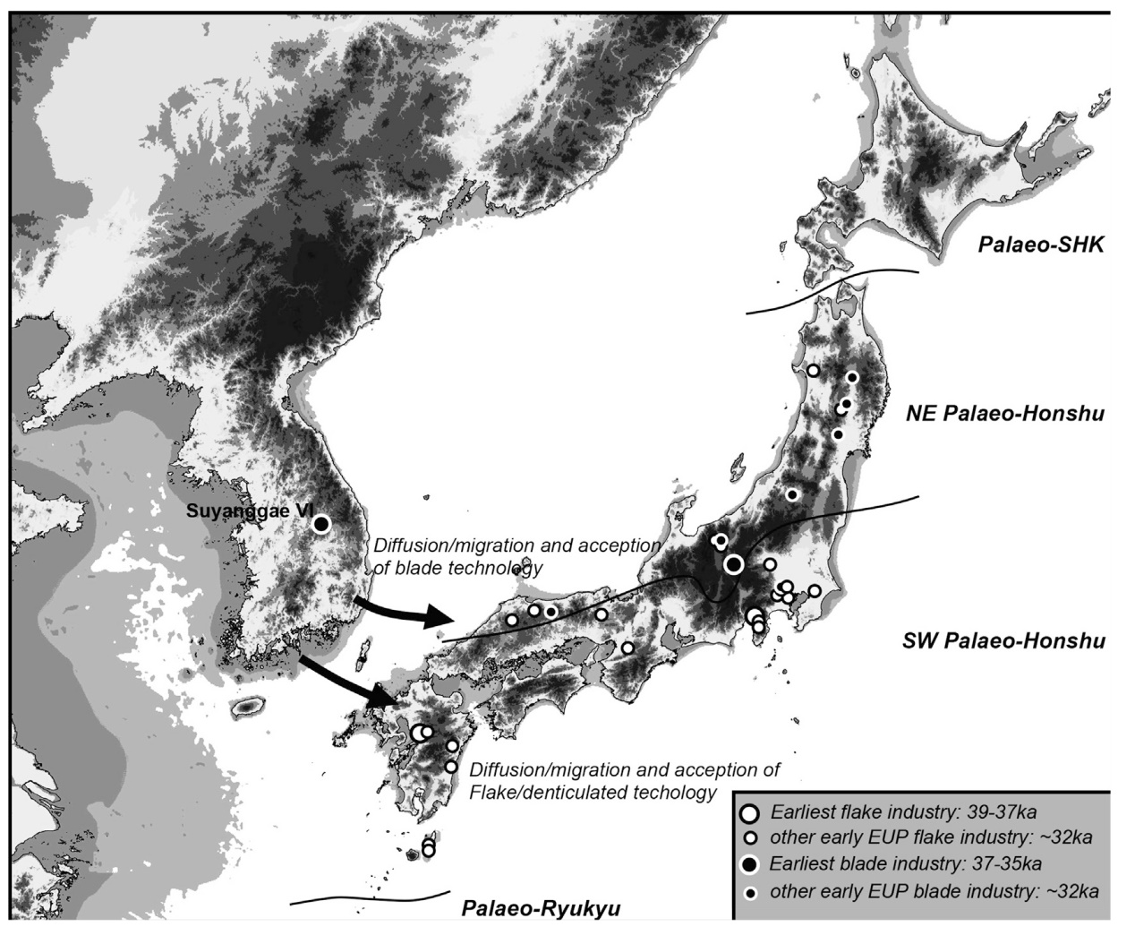 对日本旧石器时代晚期开端的探讨主要通过两种模式展开,即列岛内旧石器时代中期演化模式和大陆旧石器时代晚期扩散或迁徙模式,然而,最近来自日本和周边国家的考古学证据正对这种简单的模式提出挑战。本文批判性地回顾了包括可能存在的早中期在内的日本旧石器时代已有年代序列,并尝试展示有关日本旧石器时代晚期开端的另一种模式。本文列举了一些可能属于旧石器时代早中期的发现,并建议进一步开展地质考古研究,以了解其可信度以及与旧石器时代晚期早段(EUP)之间的文化关系。目前,日本EUP的开端以距今约3.9-3.7万年前古本州岛具有台形石器和锯齿刃器的石片工业为特征。尽管台形石器仅流行于日本EUP阶段,并且可能源自岛内更早的石器传统,但这一石器工业也在一定程度上显示出与同时期中国和朝鲜半岛石器组合的相似之处。石叶技术最早出现于古本州岛中部,比最早的石片技术晚了约1000年。虽然石叶技术可能起源于前一时期的长石片技术,但突然性的同时出现也可能意味着这一技术由朝鲜半岛扩散而来。本文认为,由于区域适应策略的不同,源自朝鲜半岛的石叶技术进入到古本州岛东北部,包括本州西部的日本海沿岸地区,而不是石片技术长期盛行的西南地区。