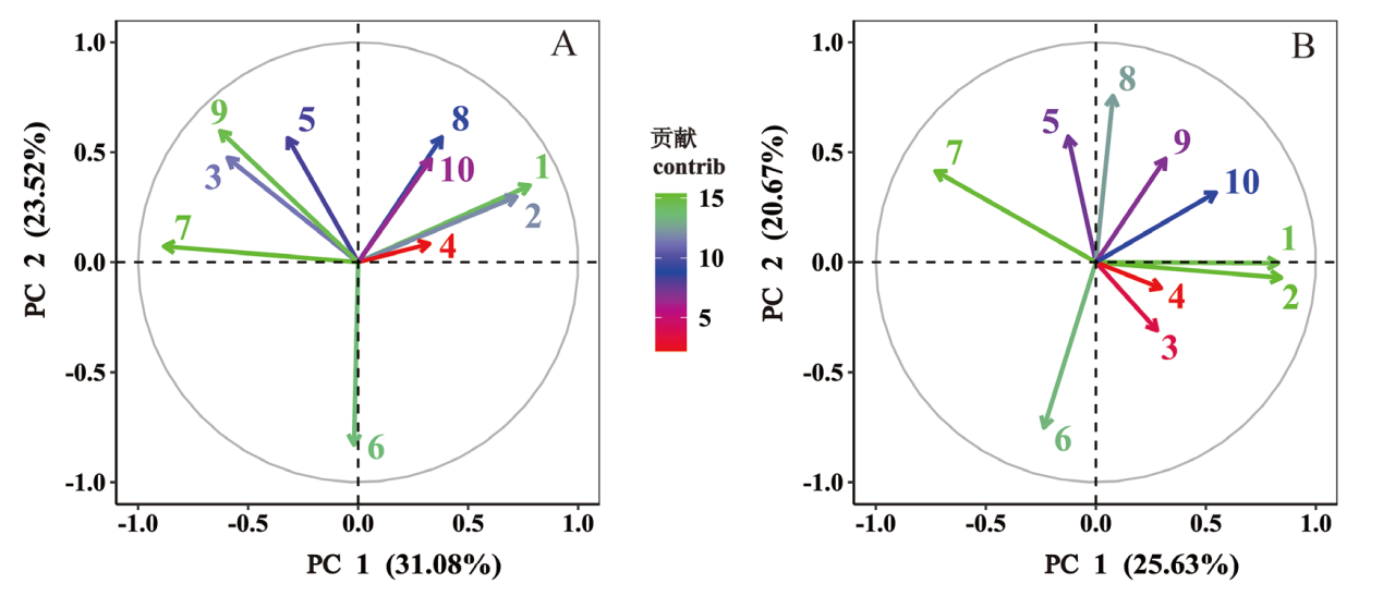 图1 牙齿形态特征变量相关图 A.世界人群World Populations ;B.东亚人群East Asia Populations;1.铲形门齿Shoveling (SUI1); 2.双铲形门齿Double Shoveling (DSUI1); 3.近中嵴Mesial Ridge (MRUC); 4.卡氏尖Carabelli’s Trait (CCUM1); 5.第5尖Cusp 5 (C5UM1); 6.四尖型Cusp 4 (C4LM2); 7.Y型沟纹Y-Groove (GPYLM2); 8.第6尖Cusp 6 (C6LM1); 9.第7尖Cusp 7 (C7LM1); 10.转向皱纹Deflecting Wrinkle (DWLM1)