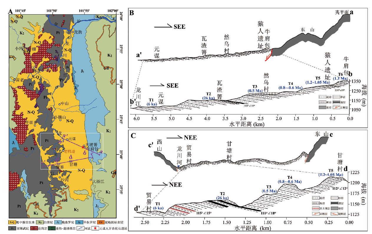 图2 元谋盆地及其周边地层分布 A.元谋盆地及其周边区域地质图 Geological map of the Yuanmou Basin and its surrounding regions; B.横跨元谋盆地a-a’和b-b’的水平剖面图 Cross sections of a-a’ and b-b’ spanning the Yuanmou Basin; C.横跨元谋盆地c-c’和d-d’的水平剖面图 Cross sections of c-c’ and d-d’ spanning the Yuanmou Basin
