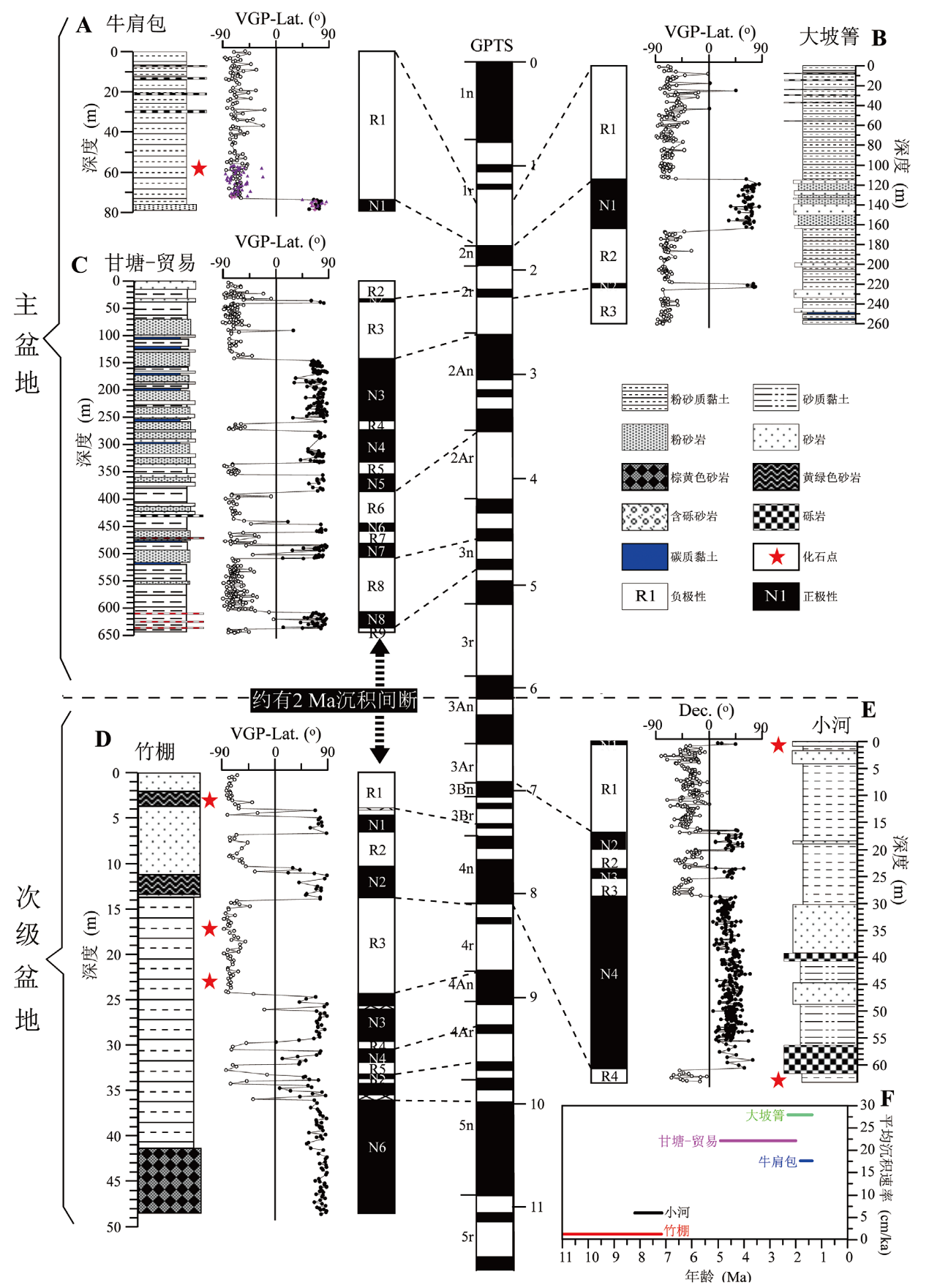 图3 青藏高原东南缘元谋盆地磁性地层年代 A-C.主盆地The main basin[40,58]; D-E.次级盆地The sub-basin[44,46]; F.平均沉积速率The average sedimentary rate