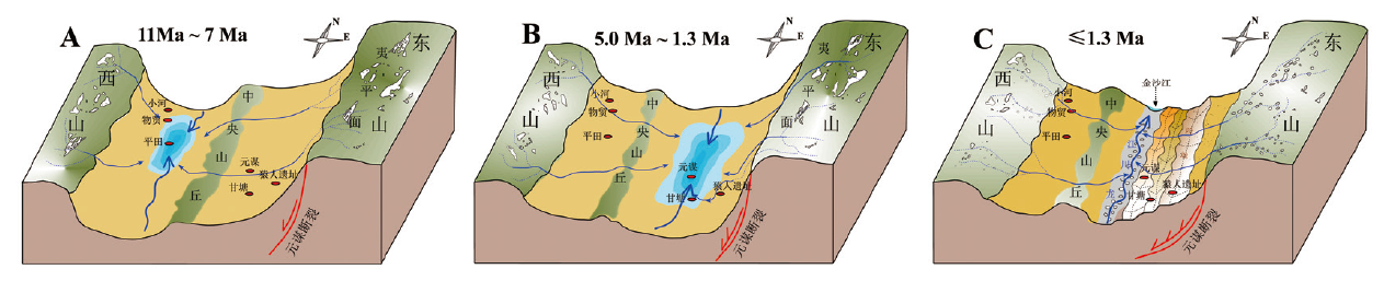 图4 青藏高原东南缘元谋盆地内部水系演化模型 A.第一阶段(11 Ma~7 Ma)/The first stage from 11 Ma to 7 Ma;B.第二阶段(5.0 Ma~1.3 Ma)/The second stage from 5.0 Ma to 1.3 Ma; C.第三阶段(≤1.3 Ma)/The third stage after 1.3 Ma