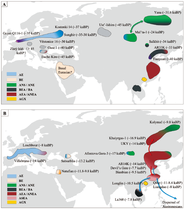 古DNA提取与测序技术的发展,让科学家们能够利用史前现代人样本直接开展古基因组研究。古基因组研究发现,在约4万年前,欧亚大陆上至少存在着6个独立的现代人群体,其中3个群体并未对现今人群贡献基因。在距今4万年至末次盛冰期结束,欧亚大陆至少有5个具有代表性的现代人群体。末次盛冰期结束后的部分现代人群体与现今人群拥有更近的遗传关系,而部分群体则未对现今人群贡献基因。本文基于末次盛冰期前(45~19 kaBP)与末次盛冰期后(19~10 kaBP)两个重要时间段的欧亚大陆史前现代人的基因组研究,梳理欧亚现代人在时间与空间上的发展脉络,重点探究此前研究相对滞后的欧亚大陆东部地区。