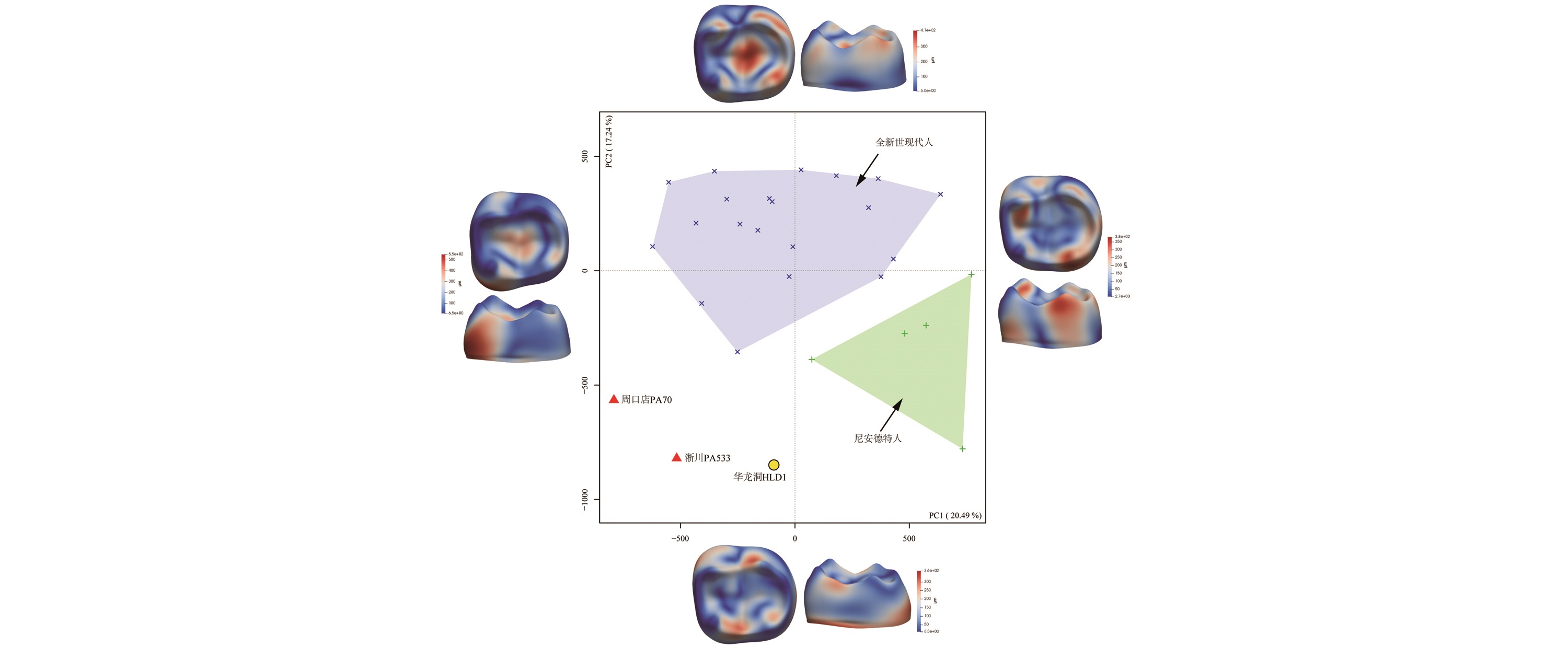 东亚中更新世古人类在头骨、下颌骨、牙齿等解剖部位表现出不同程度的形态多样性,中期成员代表为直立人,而晚期成员的演化地位具有较大争议。为进一步了解东亚中更新世古人类内部的形态变异特点和为东亚中更新世晚期古人类分类提供依据,本文使用微分同胚的表面匹配(Diffeomorphic Surface Matching, DSM)和形态测量图(Morphometric map)对下颌第二臼齿(M2)釉质-齿质连接面的形状和齿冠侧面釉质厚度分布模式进行了量化分析。结果显示:1)东亚中更新世古人类与晚期人属成员(尼安德特人和现代人)存在较明显的形态差别;2)该时段晚期的东亚古人类相对中期直立人在侧面釉质厚度分布规律上具有独特性,并在釉质-齿质连接面的三维形状上与晚期人属成员更加接近。本文在以往对东亚中更新世古人类牙齿内外结构单个性状研究的基础上,使用三维形态测量方法进一步量化了M2釉质-齿质连接面三维形状和侧面釉质厚度分布模式两项重要特征的变异特点,这对未来该时段同类型牙齿的形态鉴定以及解决东亚中更新世晚期古人类的分类地位具有一定意义。