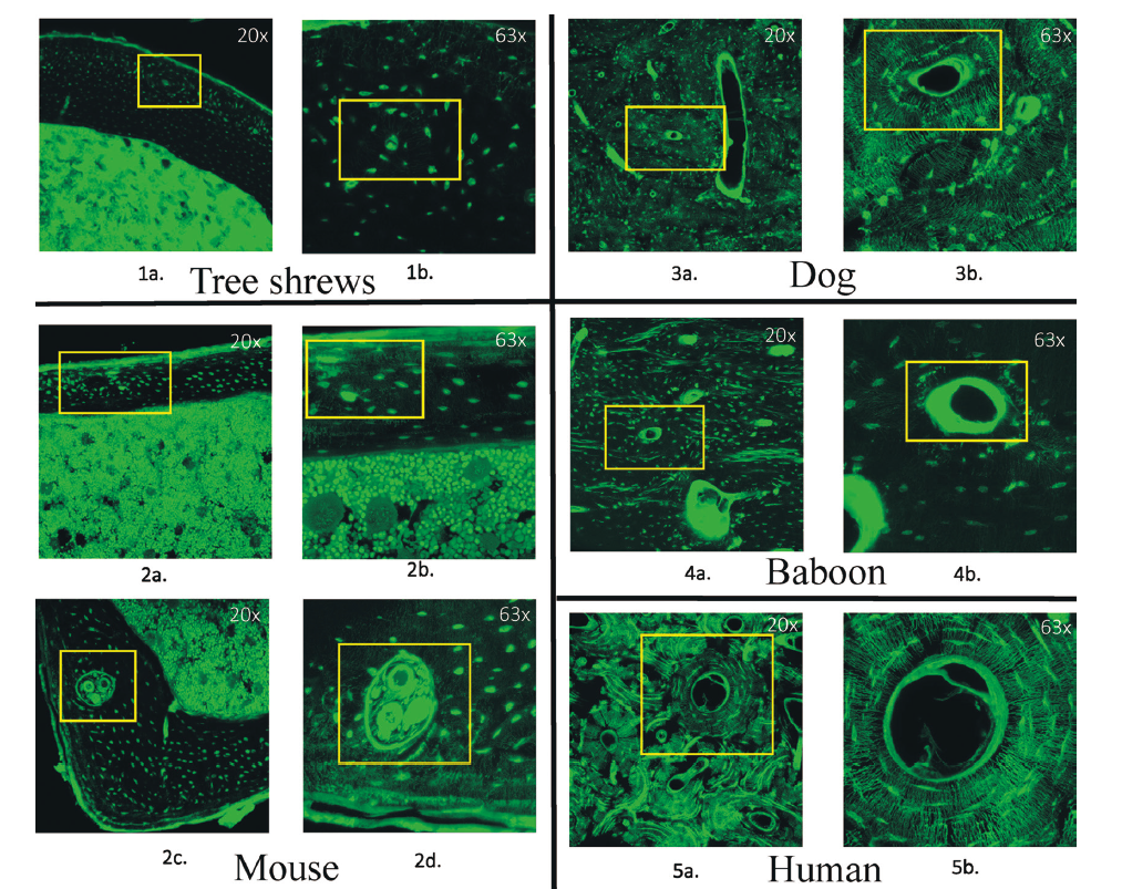 近年来,由于树鼩与灵长类动物的亲缘关系,它们引起了人类发展和疾病研究的兴趣。在这项对树鼩,鼠,狗,狒狒和人类的骨骼超微形态的比较研究中,我们定性分析了骨骼的微观结构和形态,以评估树鼩对人类的亲近程度。在3只成年雄性树鼩 (滇西亚种) (Tupaia belangeri chinensis)的股骨中,使用荧光素异硫氰酸盐样品制备和染色共聚焦成像研究了皮质骨的骨元结构,并使用酸蚀刻SEM观察了骨细胞穴的形态。总体而言,树鼩中骨样形成物的密度和结构以及骨细胞穴的形态更像鼠, 与人类,狗和狒狒都明显不同。这些发现表明,尽管树鼩在系统发育上比鼠更接近人类,但它们的骨骼超微形态仍与鼠接近。这是除狗和狒狒之外,第一次对树鼩的骨元和骨细胞穴进行超微影像的研究。这个比较研究的结果丰富了我们对早期灵长类动物骨骼发育,适应性和进化的理解。未来有必要进行进一步的定量比较研究来表征树鼩骨骼的微观形态。