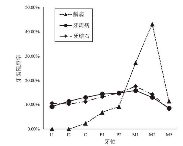 | 牙周病Periodontitis | 上颌 (140) Maxillae | 11.43% (16) | 11.43% (16) | 15.00% (21) | 15.00% (21) | 14.29% (20) | 15.71% (22) | 10.71% (15) | 6.43% (9) |