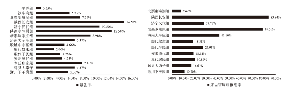 | 遗址Site | 年代 Period | 经济类型Economy | 个体数/总牙数Individual Number/Teeth Number | 个体患龋率 Caries Prevalence of Individual | 牙齿患龋率 Caries Prevalence of Tooth | 个体牙周病罹患率Periodontitis Prevalence of Individual | 牙齿牙周病罹患率Periodontitis Prevalence of Tooth |