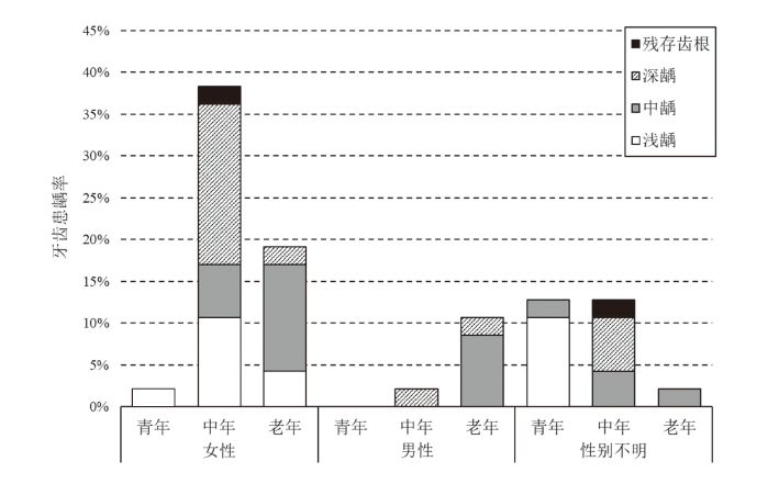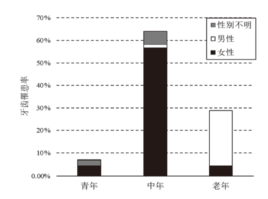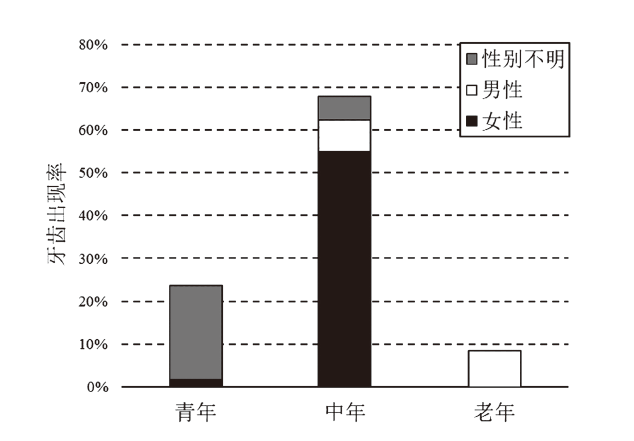 | 牙病 Dental disease | 男性(126枚)Male | 女性(310枚)Female | 共计(436枚)Total |