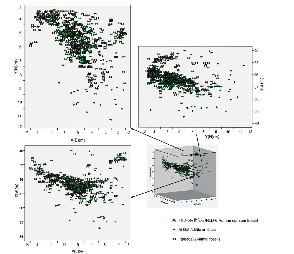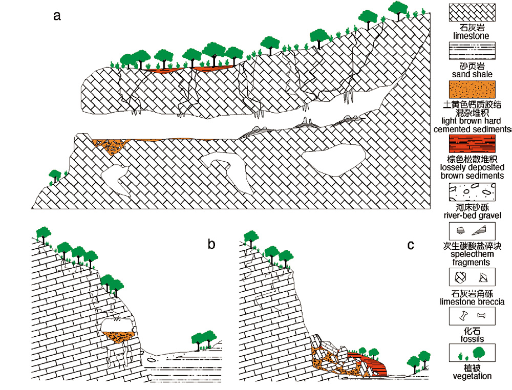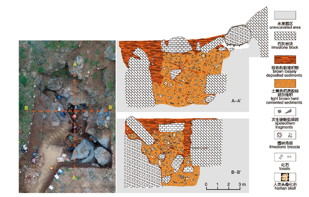 HLD cave is situated in the south slope of a small anticline named Meiyuan Hill. Constrained by the regional geological background, geomorphic features around HLD include lower mountains in the southeast, gentle hills and a lake plain in the northwest. The ancient HLD cave developed in the Upper Cambrian Formation, which consists of banded micritic limestone and dolomitic limestone, materials formed in a deep marine environment, and has been moderately karstified and mineralized over time. The initial formation of the ancient HLD cave likely commenced not later than the early Middle Pleistocene, as many broken speleothems were dated beyond the upper limits of the U-series dating. The original cave deposits were about 20 m higher above its current location, as indicated by the in situ flowstone and stalagmites exposed, which were formed inside the ancient HLD cave. Synsedimentary dismantlement, downward slippage, and bedrock weathering are indicated by the brecciated arrangement of the limestone rock blocks, cemented angular, subangular clasts and archaeological remains within the excavation area. Slipping and collapsing of the cave system proceeded from north to south, probably driven by the down-cutting of the valley and karst erosion.