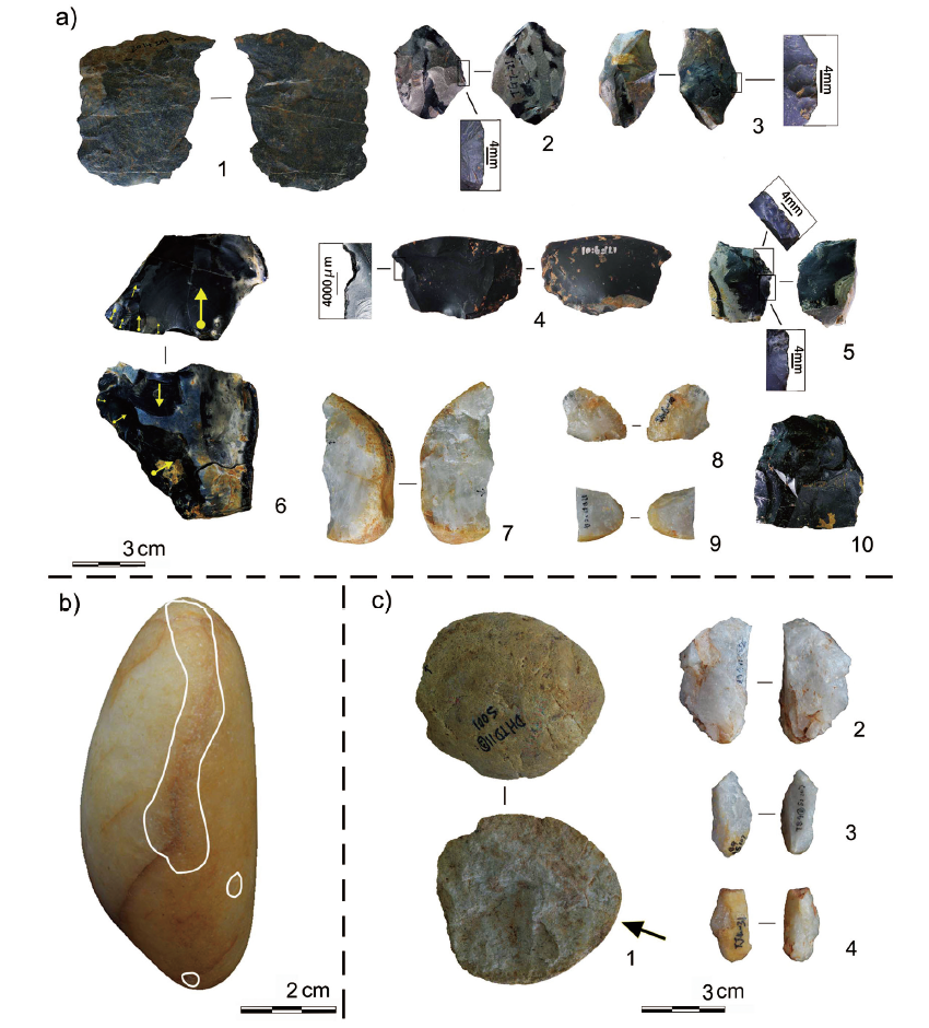 Bone fragmentation is common and includes both diagenetic and green fractures probably produced by carnivore bone cracking and hominin hammerstone breaking. Additionally, carnivore (tooth pits, gnawing and scores marks) and human (cut marks) actions are documented over the bones. The stone tool assemblage is typical of Mode 1, i.e. the core-and-flake industries. Typologically, the HLD lithic assemblage is small (n=38) and is dominated by quartz (65.8%) and chert (21.1%), plus some lava (10.5%) and limestone (2.6%) artifacts. Most stone tools are complete flakes (60.5%) or debitage (31.6%), with only one specimen each of core, retouched and battered artifact categories. Quartz and lava show fluvial cortex and suggest sourcing from streams, whereas chert nodules derive from the nearby Sinian siliceous carbonate-clastic strata formation. A minimum of 44.4% of the quartz products were obtained through bipolar flaking, whereas all of the chert flakes were knapped with a freehand technique. The raw material quality of chert flakes is high, which may explain heavier reduction observed in their dorsal faces. Most chert flakes show use-wear, probably associated with carcass processing given the presence of cutmarks on some bones.