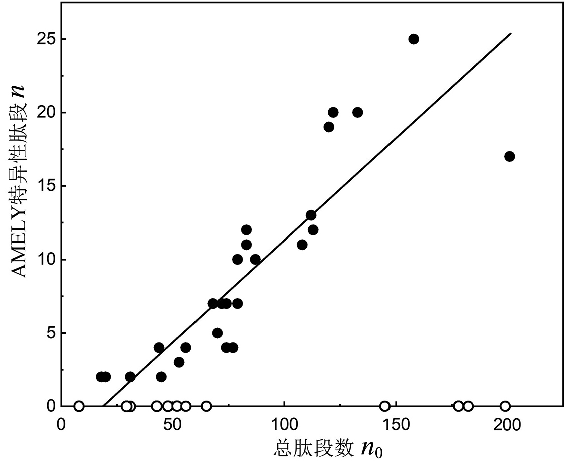 Fig.7 Correlation of the number of total peptides with AMELY unique peptides Solid circles represent samples with AMELY peptides, and hollow circles represent samples without AMELY peptides. Only solid circles are linearly fitted