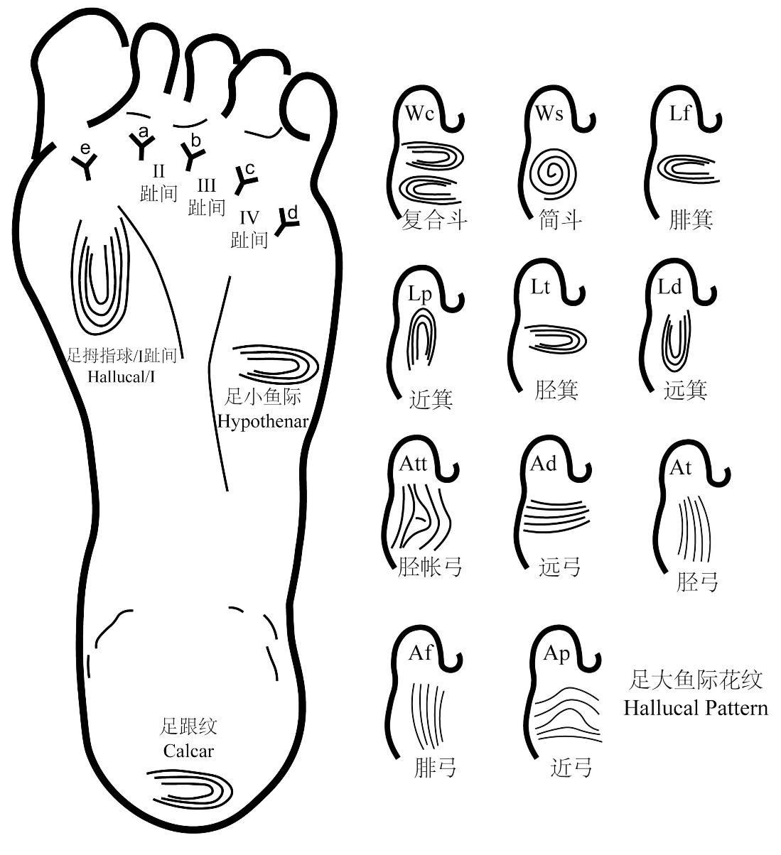 Dermatoglyphics, formed by the raised ridge patterns on the skin surface, play a crucial role in personal identification, population genetics, and disease diagnosis. This study provides the first comprehensive analysis of soleprint phenotypes in the Mongolian population. Additionally, a comprehensive analysis of dermatoglyphic patterns in this population is presented, encompassing frequency distributions and combination characteristics across genders and bilateral sides. Specifically, we examined: 1) fingerprint patterns categorized as simple arch, tented arch, radial loop, ulnar loop, simple whorl, and double whorl; 2) palmprint phenotypes including the pattern in the thenar, hypothenar, interdigital regions II, III, IV, and their transitional regions (II/III, III/IV), along with the prevalence of simian lines, triple radial base lines, cdt triradius; 3) soleprint phenotypes in interdigital regions II, III, and IV, along with patterns observed in the hallucal region, hypothenar region, and calcar region. Our analysis in Mongolian population revealed distinct dermatoglyphic pattern distributions across different fingers: double whorl exhibited higher frequency in thumbs, radial loop predominated in index fingers, ulnar loop showed increased prevalence in middle and little fingers, and simple whorl were more common in ring fingers. Bilateral symmetry was observed in homologous fingers, demonstrating a significant tendency for pattern concordance. The pentadactyl pattern combinations exhibited non-random distribution characteristics. Regarding palmprint configurations, the highest frequency of true patterns was observed in interdigital region IV. Soleprint analysis indicated a predominance of loop pattern on the hallucal region, with arch patterns showing relatively lower frequency. Through cluster analysis and principal component analysis of 39 Chinese ethnic groups with complete soleprint phenotypes, we have identified three distinct population clusters: Southern, Northern, and Central Asian groups, based on dermatoglyphic phenotypes. Intra-site phenotypic correlation analysis demonstrated significant associations between fingerprint patterns, as well as between true patterns in palmprint and soleprint interdigital regions. Cross-site analysis revealed a strong positive correlation between total fingerprint ridge count (TFRC) and palm a-b ridge count (a-b RC), suggesting that populations with higher TFRC tend to exhibit increased ridge counts in the a-b interdigital region. Furthermore, significant correlations were identified between palmar and plantar interdigital regions, with palm interdigital regions showing the highest frequency of true pattern occurrence. These interregional associations warrant further investigation as potential focal points for future research. Notably, soleprint demonstrate significant diagnostic value, contributing up to 25% of the discriminative information in specific disease identification. This study not only fills the gap in the study of Mongolian soleprints, but also provides a theoretical basis for the application of dermatoglyphics in individual identification, population discriminant, and auxiliary diagnosis of diseases.