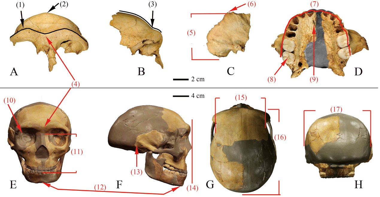 | HLD 8 | 额骨残段 | 左侧眼眶上缘大部及相邻的额骨鳞部 | 不能确定 | 成年 | 2015 |