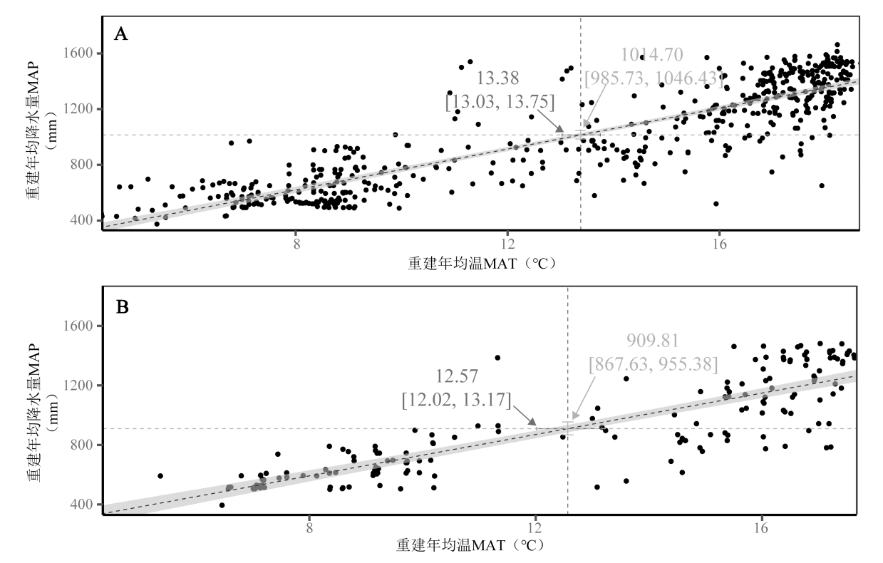 The 45 extant species at the HLD site collectively reflect a forest-dominated habitat; however, the top eight dominant species, as determined by minimum number of individuals (MNI), indicate a mixed forest-grassland environment. Based on the MNI, we analyzed the habitat preferences of these dominant species. Among them, Pteromys volans and Lasiopodomys brandtii are primarily distributed in temperate regions; Eothenomys melanogaster is usually inhabited subtropical and tropical shrublands; species of Apodemus and Niviventer andersoni are mainly found in temperate and subtropical areas; while Mus musculus is widely distributed from tropical to temperate zones. These species typically inhabit various forest types and meadow environments at forest edges. In light of the small mammal assemblage, we infer that the HLD site in Dongzhi, Anhui, during the late Middle Pleistocene, featured a mixed environment of forests and meadows. The mean annual temperature (MAT) and mean annual precipitation (MAP) reconstructed using the Random Forest algorithm for the late Middle Pleistocene HLD site were 12.57°C and 909.81 mm (based on the eight MNI dominant species) and 13.38°C and 1014.70 mm (based on all 45 extant species), respectively. These values are lower than the meteorological data from present-day Dongzhi (16.1°C and 1628.3 mm), indicating that the climate at that time was somewhat cooler and drier.