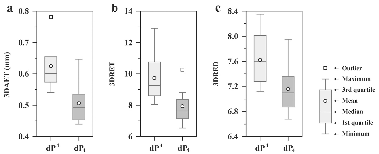 | 检验结果Test results | 釉质体积Ve (mm3) | EDJ面积SEDJ (mm2) | 齿质体积Vd (mm3) | 3DAET(mm) | 3DRET | 3DRED |