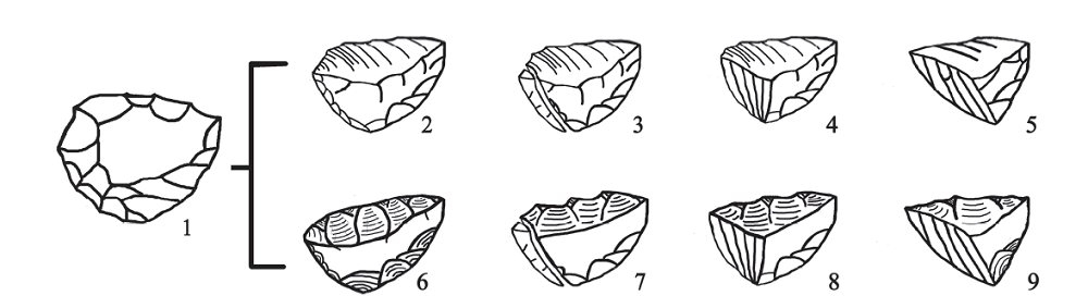 Fig.4 Dynamic mode of wedged-shaped cores from the Fenglin site 1:石核原料采备阶段(Core preparation stage);2~5:分别为Ⅰ类楔形石核的初期、中期、调整、废止阶段(Initial stage、mid-term stage、adjustment stage and abandoned stage of TypeⅠ);6~9:分别为Ⅱ类楔形石核的初期、中期、调整、废止阶段(Initial stage、mid-term stage、adjustment stage and abandoned stage of TypeⅡ)