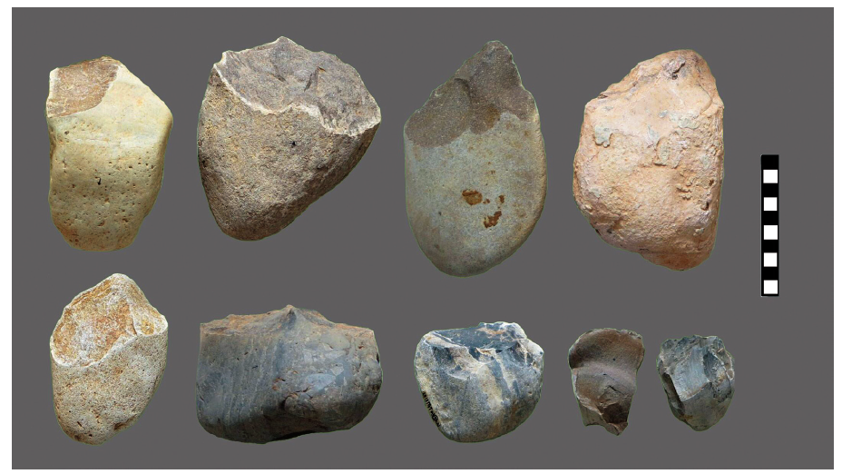 | 7 | 砾石、石片、砍砸器、手镐、刮削器、断块等 | 76 | 9.14% |