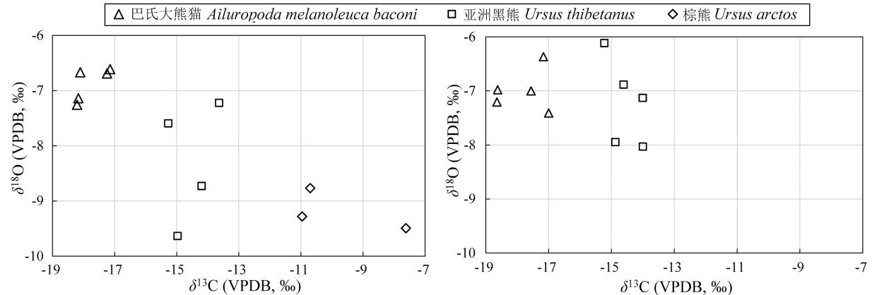 This study investigates the dietary ecology of three sympatric Ursidae species— Ailuropoda melanoleuca baconi, Ursus thibetanus, and Ursus arctos — from two sites at Hualonglong (locality 1: ~300 ka; locality 3: late Middle Pleistocene to Late Pleistocene) in Anhui Province, southern China. Through stable carbon and oxygen isotope (δ13C, δ18O) analysis of tooth enamel, this study reveals distinct ecological strategies: at locality 1, U. arctos (n=3) occupied intermediate woodlands (δ13Cdiet= −23.1‰±1.9‰), while A. melanoleuca baconi (n=5) and U. thibetanus (n=4) inhibited close-canopy forests (δ13Cdiet values are −27.8‰±0.6‰ and −27.8‰±0.8‰, respectively). The latter exhibites more diverse dietary ecology, as reflected by their varied δ18O values (−6.9‰±0.3‰ and −8.3‰±1.1‰). By locality 3, U. arctos were absent, but A. melanoleuca baconi (n=5) and U. thibetanus (n=5) continue to inhabit close-canopy forests. The δ18O convergence between A. melanoleuca baconi (−7.0‰±0.4‰) and U. thibetanus (−7.2‰±0.8‰) suggests possible ecological shifts in U. thibetanus. Regional comparisons (Guangxi: Baxian Cave, Quzai Cave, and Yugong Cave from previous studies; Anhui: two localities at Hualongdong in this study) indicate that during the middle-late Pleistocene, both A. melanoleuca baconi (δ13Cdiet values were −27.1‰±1.0‰ (n=20) in Guangxi and −27.8‰±0.6‰ (n=10) in Anhui) and U. thibetanus (δ13Cdiet values were −27.7‰±1.7‰ (n=10) in Guangxi and −27.8‰±0.6‰ (n=9) in Anhui) consistently exploited close-canopy forests in Guangxi and Anhui, yet maintained niche partitioning at each sites. By integrating isotopic data from Pleistocene Ailuropoda, we observed a gradual shift towards more positive δ13Cdiet values from the Early Pleistocene Ailuropoda microta (data from Gigantopithecus Cave and Yanliang Cave in Guangxi, δ13Cdiet= −28.2‰±1.0‰, n=8) and A. melanoleuca wulingshanensis (data from Longgu Cave in Hubei, δ13Cdiet= −27.7‰±0.7‰, n=4) to the middle-late Pleistocene A. melanoleuca baconi (all aforementioned specimens from Guangxi and Anhui, δ13Cdiet= −27.3‰ ±0.9‰, n=30). Their δ18O values also varied by regions and periods. The spatiotemporal isotopic differences in Pleistocene Ailuropoda, linked to their specialized bamboo-diet, underscore the differences in regional paleoenvironments in southern China. In Guangxi, A. melanoleuca baconi exhibited slightly higher δ13Cdiet values and a broader range of δ18O values compared to A. microta. This may suggest that, with the increase in body mass and food intake, A. melanoleuca baconi occupied more open habitats and utilized bamboo more diversely, as potentially evidenced by a wider variety of bamboo species, parts, and distribution ranges. This study provides the first isotopic evidence for sympatric Ursidae niche partitioning in southern China, offering critical paleoenvironmental context for understanding the coevolution between human and non-human animals in this region.