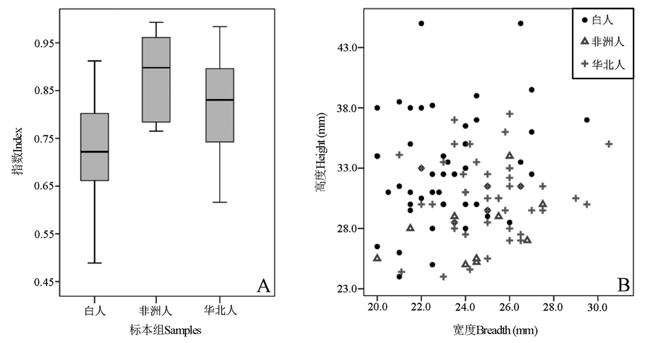 Fig.3 Box plot of nasal aperture indices (A) and distributions of nasal height versus breadth for individual specimens (B) of American Caucasian, African Negro and North Chinese populations