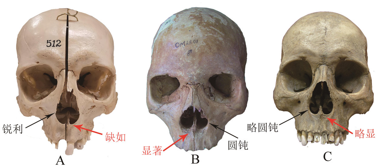 | 梨状孔形态morphology of nasal aperture | 高狭窄,I=73.3 | 低矮宽阔,I=88.1 | 高狭窄,I=84.3 |