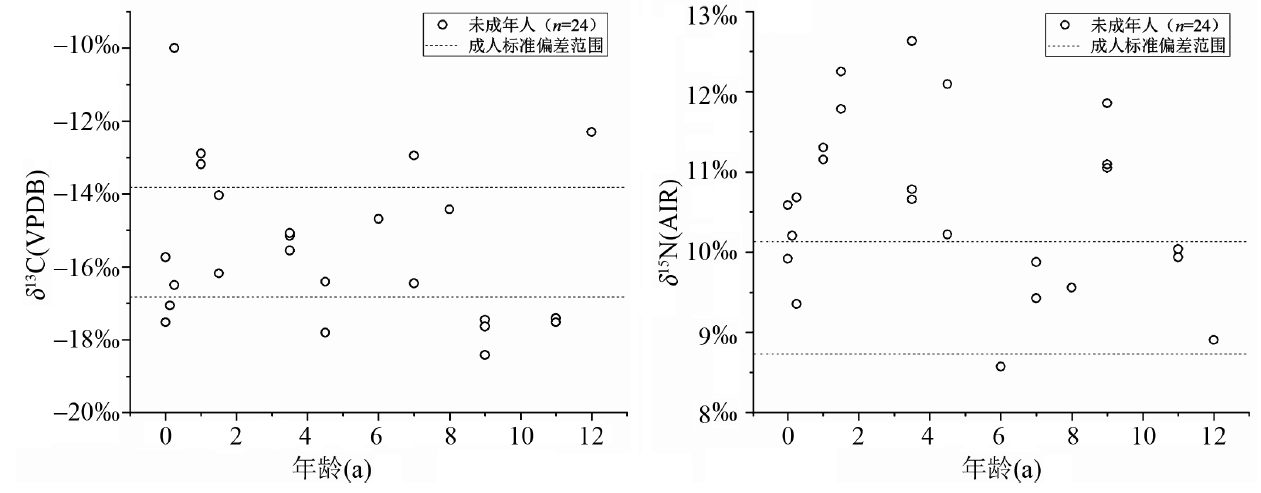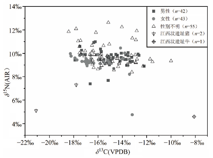 Tab.1 δ13C and δ15N of different groups of people at the Zhongjialiangzi site