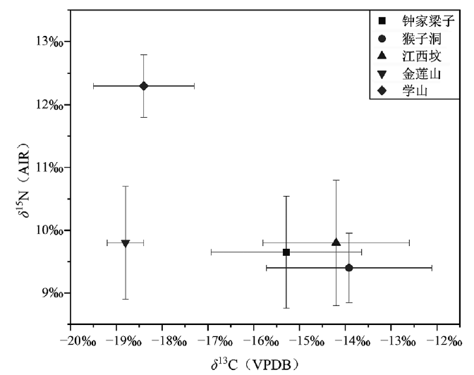 Fig.6 Scatter plot and error bar chart of δ13C and δ15N of human bone samples in the middle and lower reaches of the Jinsha River and surrounding sites